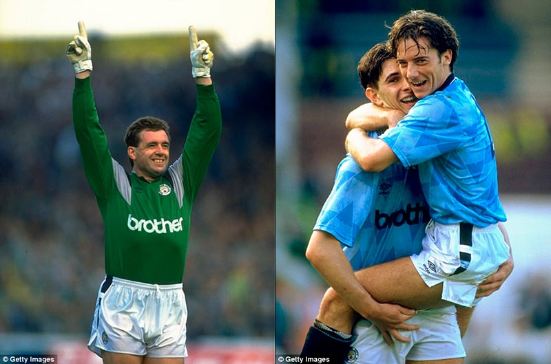 Мало кто из давних болельщиков забудет тот матч на «Мейн Роуд» осенью 1989 года, когда «Сити» уничтожил соседей со счетом 5-1. Босс «Юнайтед» Алекс Фергюсон, находившийся тогда под давлением, сказал, что в тот вечер вернулся домой и несколько часов лежал на кровати, спрятав голову под подушку. Голкипер «Сити» Пол Купер празднует один из голов своей команды. Йан Бишоп и Пол Лэйк не могут скрыть своей радости.