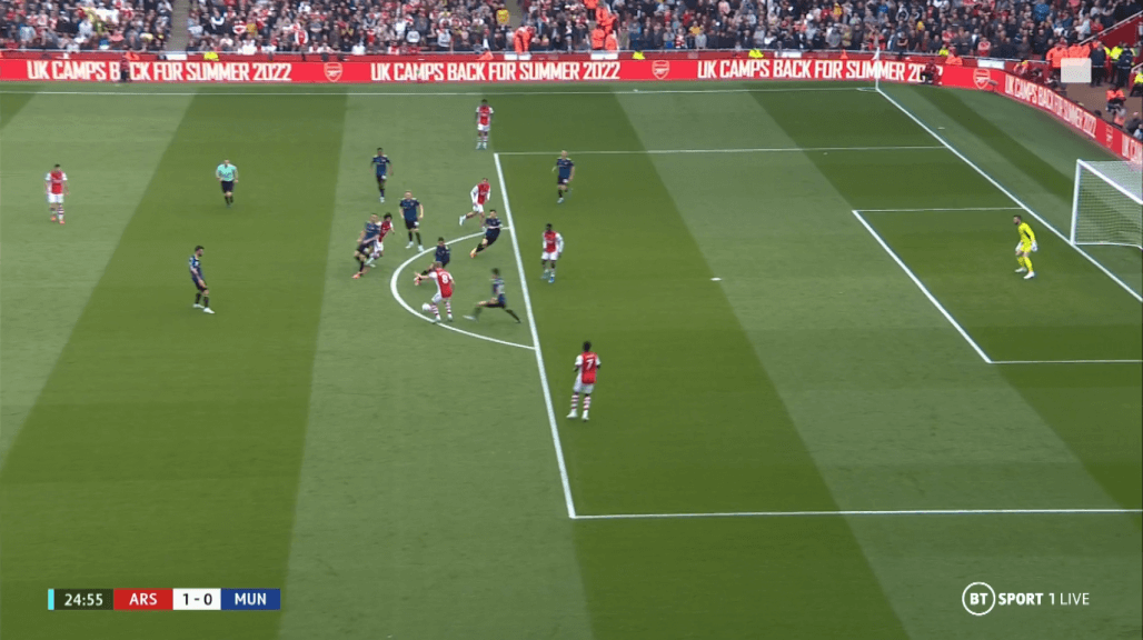 А началось все, как и свойственно нашей обороне в этом сезоне, по-идиотски. Крайне простой и не опасный момент превратился в клоунаду от Варана и Теллеса, которые не смогли попасть по мячу. Но с ударом от Сака справился Давид! И давайте все вместе скажем имя человека, который болт положил на игру в обороне? Диогу Далот! Что он делает в старте после игры «Паука» в прошлом матче? Да и своей игры в последних трех встречах. В момент удара они с Таварешом бегут на равных.