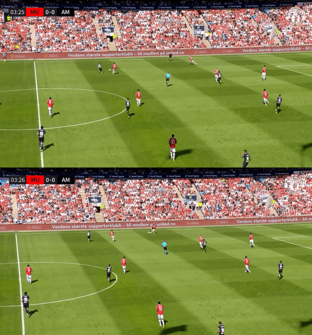 Спустя минуту «Атлетико» пытается провести позиционную атаку. У команды Симеоне сразу возникли проблемы вследствие грамотного прессинга Юнайтед.Мактоминей накрывает ближайшего адресата для передачи в центре, из-за чего игрок «Атлетико» отдает мяч на фланг, но и здесь возникают трудности – Далот готов встретить мяч на фланге.
