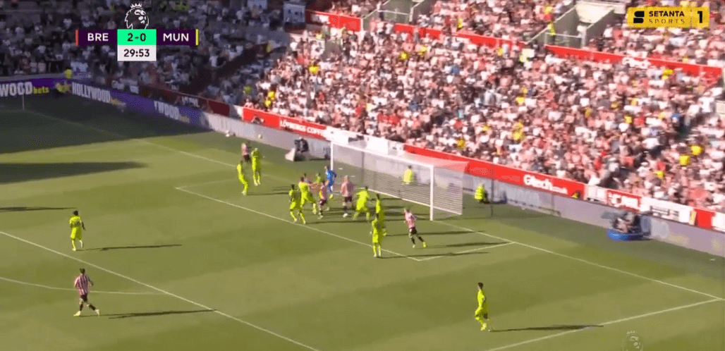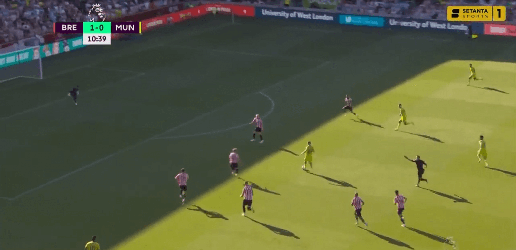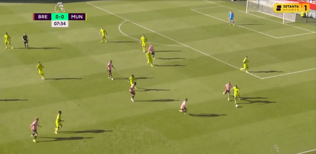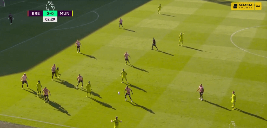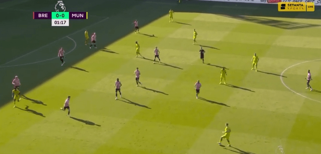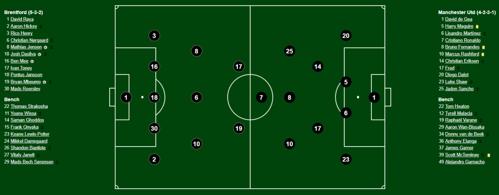 Схематично состав «Брентфорда» был изменен под соперника. В прошлой игре против «Лестера» был выбран оборонительный вариант с двумя центральными защитниками, но игроки атаки проводили большую часть на своей половине поля. Во вчерашнем же матче против «Юнайтед» в составе оказалось больше игроков атакующего плана, а схема изменена на 3-5-2: в нападение команды присоединился вернувшийся в состав Джошуа Дасилва.