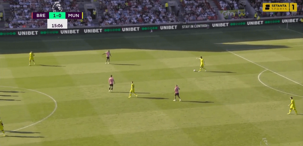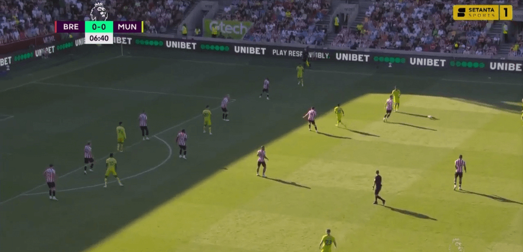 Не всегда мяч переводился на противоположный фланг. В основном пасы шли ближнему игроку, и он, в данном случае Фред, терял его либо вследствие плохого приема, либо организованного прессинга со стороны игроков «Брентфорда».