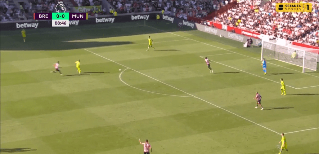 Оборона «Брентфорда» позиционно грамотно располагается, атакующие игроки «Юнайтед» не создают проблем для них ни с мячом, ни без мяча. Тройка центральных защитников «Брентфорда» неплохо отдохнула, пока прикрывала Криштиану. Ведь в первом тайме не было даже намека на навес для португальца. Санчо и Далот не доводили дело до удара. Рэшфорду защитники пчел давали уйму времени и много свободы, понимая, что англичанин мало что создаст: откатит мяч назад, либо пойдет в обыгрыш, к которому защита успеет подготовиться. А игра Маркуса с каждой минутой в первом тайме становилась хуже.