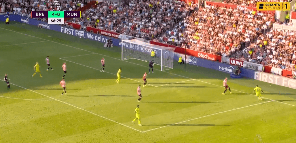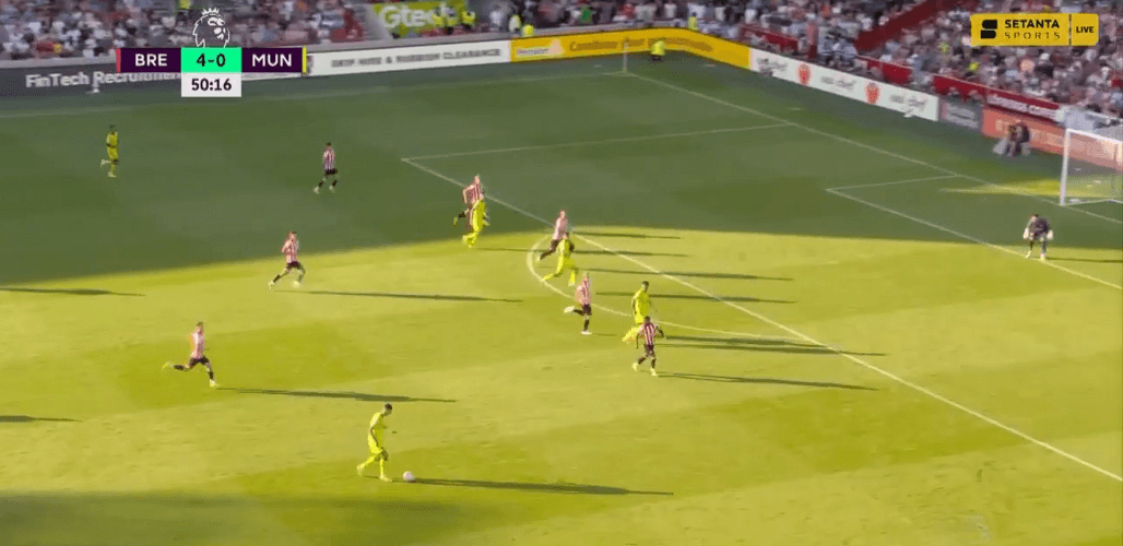 Подопечные Томаса Франка, даже ведя в 4 гола, старались держать мяч, что им и удавалось, пока на пятидесятых минутах матча не было создано пару неплохих моментов. Контратака, в которой у Далота имеется несколько хороших вариантов продолжения атаки. Видимо, португалец устает от бесконечных розыгрышей с Санчо и навешивает на Криштиану, но Роналду не оказывается готов.