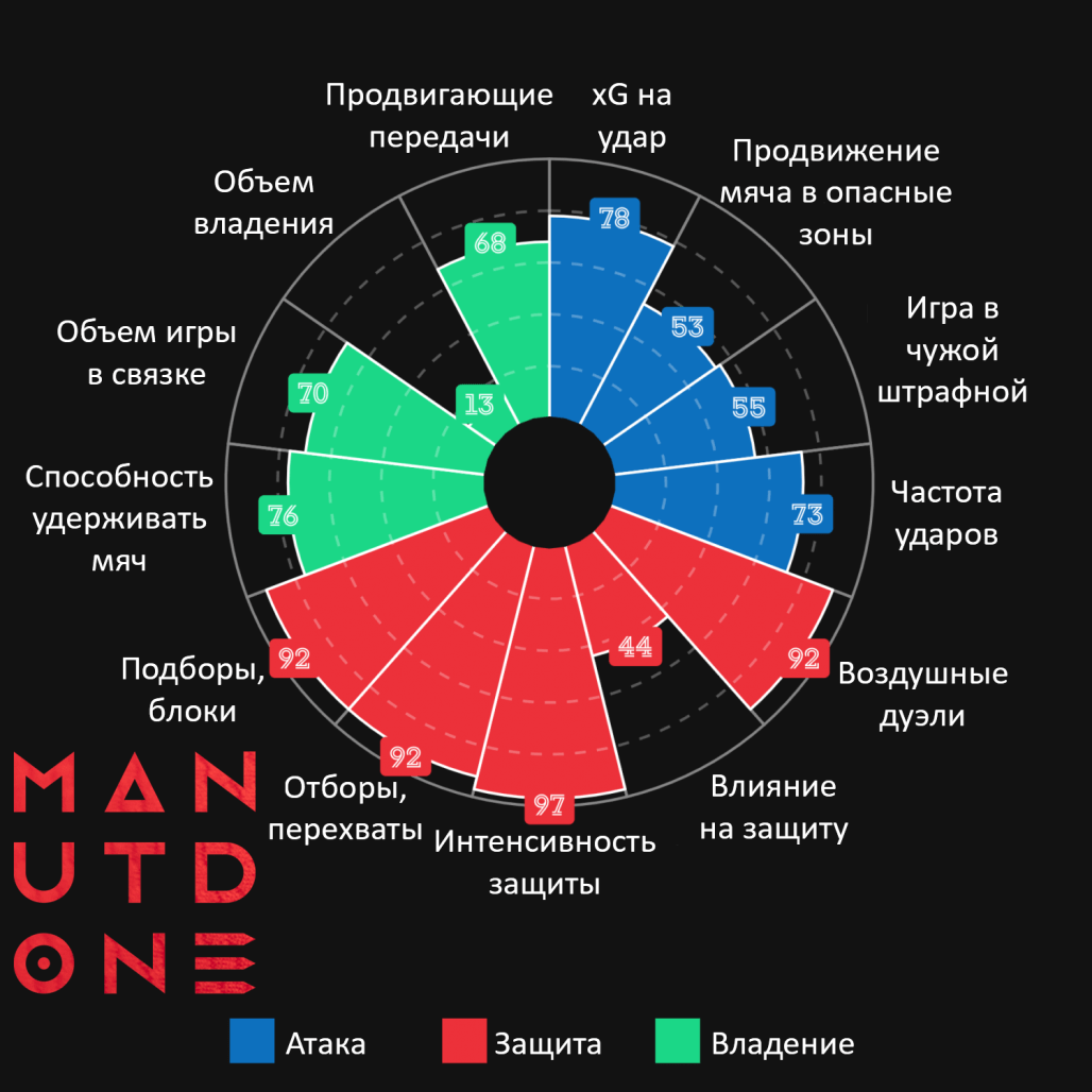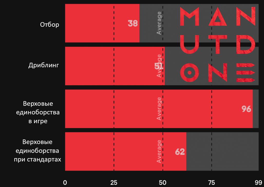 Из 31 попытки Каземиро преуспел лишь 13 раз. Это заметно и по графику, согласно которому бразилец не так уж эффективен в предотвращении дальнейшего продвижения соперника (влияние на защиту: 44/99). Его рейтинг дуэлей – оценка способностей игрока в поединках 1 на 1 с поправкой на силу соперника – также говорит о несовершенной технике отбора (38/99). Тем не менее, часто целью было добраться до мяча и хотя бы на время сорвать атаку соперника, а не уйти с мячом.