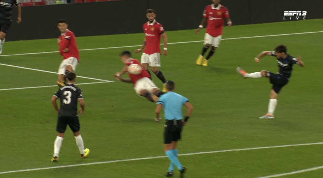 Правда счастье продлилось недолго: после розыгрыша углового произошёл самый курьезный момент в матче – пенальти в ворота Давида. Лисандро стелился в подкате после удара Сильвы. Аргентинец всё делал правильно, сокращал дистанцию и начал складываться под удар. Мяч попадает в бедро Мартинесу и уже после этого задевает переднюю конечность защитника. 6-ой номер не разводил руки, а, наоборот, старался прижать к телу. Но главного арбитра это не сильно волновало. Даже не задумываясь свистит Марко ди Белло (говорящая фамилия – прим. ред.) и указывает на 11-метровую отметку. ВАР же в этом эпизоде, как быстро появился на экранах, так же быстро и удалился. Грубейшая ошибка рефери, но уже ничего не исправишь. Де Хеа хоть и угадал угол, но потащить такой точный удар было чрезвычайно сложно.