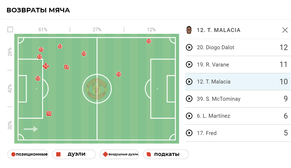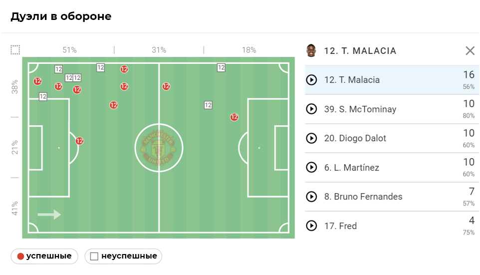 С тех пор предпочтение отдавалось Маласии: голландец впечатлил всех своими оборонительными способностями. Тайрелл играл более оборонительную роль и выиграл 48,2% единоборств. Шоу отстает от него с показателем в 40,7%. В первом старте за «Манчестер Юнайтед» Маласиа принял участие в 16 оборонительных дуэлях, в основном против Мохамеда Салаха. Защитник выиграл девять, большинство из которых проходили в критических зонах. Маласиа отлично читает воздушные угрозы – 57% успешных дуэлей на втором этаже.