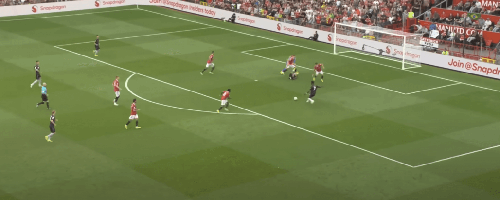 Диогу в борьбе с Габриэлем оказывается первым на мяче и легким касанием выбивает его в центр. За секунду до этого Лисандро бросил опекать Сака и выдвинулся помочь остановить Жезуса.