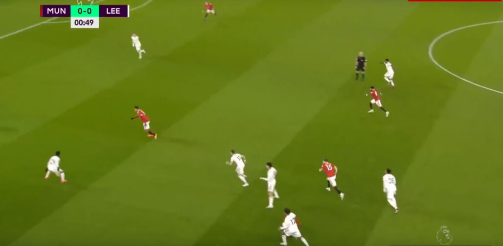 • «Лидс» активно идет в прессинг на Бруно, а португалец привычно заигрывается с мячом. Он смог обойти Адамса, но вот Стрейк мяч перехватил, отдав его сразу Ньонто. Это привело к двум проблемам: численному большинству «Лидса» в атакующей фазе и плохому оборонительному построению. Посмотрите, как много пространства у Бэмфорда.