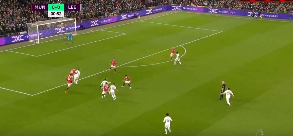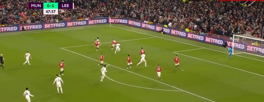 Вот так 5 небольших ошибок приводят к печальному исходу. Дальше мы увидели типичную игру «Юнайтед» против аутсайдера. Наши парни забирают мяч и полностью контролируют ход матча. «Лидс» смотрелся бодренько и крайне агрессивно шел в прессинг, но было видно, что уровня команде в белом не хватает капитально: то в своих же ногах при финте запутаются, то убежать не смогут. Поэтому приятная глазу игра не принесла ничего кроме еще одного момента на 10 минуте, когда Бруну вновь сотворил непонятное действие, не дав мячу уйти в аут, привезя угловой. Следует навес, который замыкает на дальней штанге Стрейк, но Давид успел среагировать на мяч, летящий в противоход, пускай и на удобной высоте.