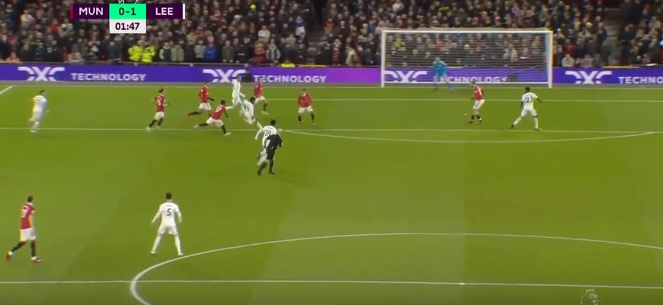 Через пару минут Джейдон, как от стоячего, уходит от Эйлинга, находя Шоу в разрезе. Люк пытается прострелить, но дорабатывает Кох. Однако, мяч отлетает прямо на ногу Санчо, который опережает сразу четверых игроков «Лидса». Мелье не успевает среагировать на мяч, вылетевший из-под пятки Вебера.