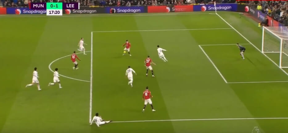 Далот смещается на Ньонто, Мартинез играет по Бэмфорду, а вот Рафа просто наблюдает за забеганием Саммервилла. Ускорение к мячу он делает только в момент передачи! В итоге Давид реагирует на прострел от вингера «Лидса», выходит на его перехват, а Рафа срезает мяч в ближний. Варан говорил, что уже задыхается от количества игр. Видимо, этим можно объяснить достаточно блеклую игру француза в прошедшей встрече. Не все обладают силами, которые есть у Бруну.