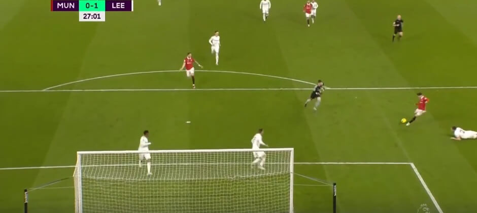 26 минута. Очередная гениальная передача от Бруну, и тут Гарначо делает все верно, убирает и вратаря, и Эйлинга, но к моменту удара уже двое футболистов «Лидса» на линии ворот.