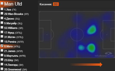 Вообще, все нападение медленно соображало, кроме одного человека. Хуан Мата третий раз за последние четыре матча лучший игрок в составе «Юнайтед». 5 ключевых передач, 55 из 62 точных передач и большая часть вперед. Плюс он еще очень часто подменял Перейру и Джеймса на позициях вингеров и даже помогал Ван-Биссаке, через которого строилась большая часть наших атак, и он не всегда успевал возвращаться домой, что очень хорошо видно на тепловой карте.