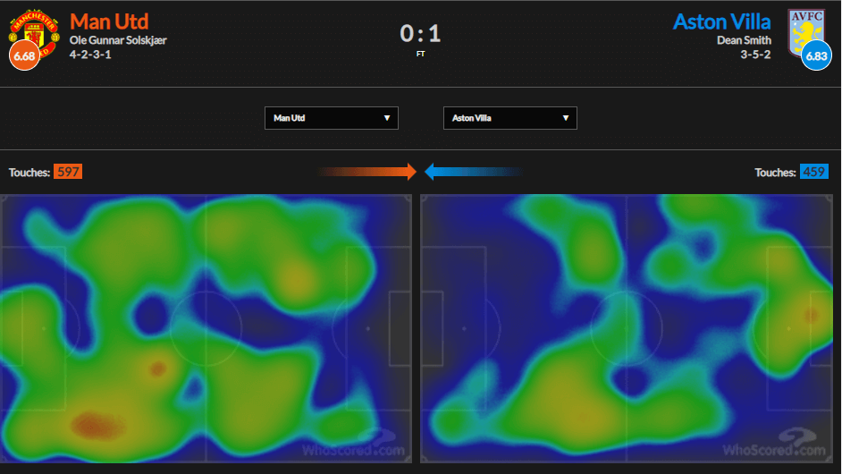 По рисунку «Астон Вилла» была переиграна полностью. Кэш и Таргетт не могли сдержать Гринвуда и Погба, у которых на двоих 6 удачных обводок за 10 попыток. У гостей вообще мяч не держался в опорной зоне. Посмотрите тепловую карту.