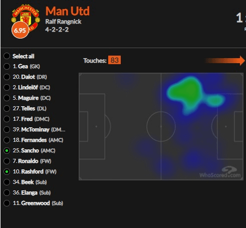 Ситуация по движению немного исправилась после 65-й минуты, потому что Гринвуд, а в последствии и Эланга, как раз-таки не покидали правый фланг, играя вместе с португальцами. А вот Бруну оставили наедине с Джейдоном.