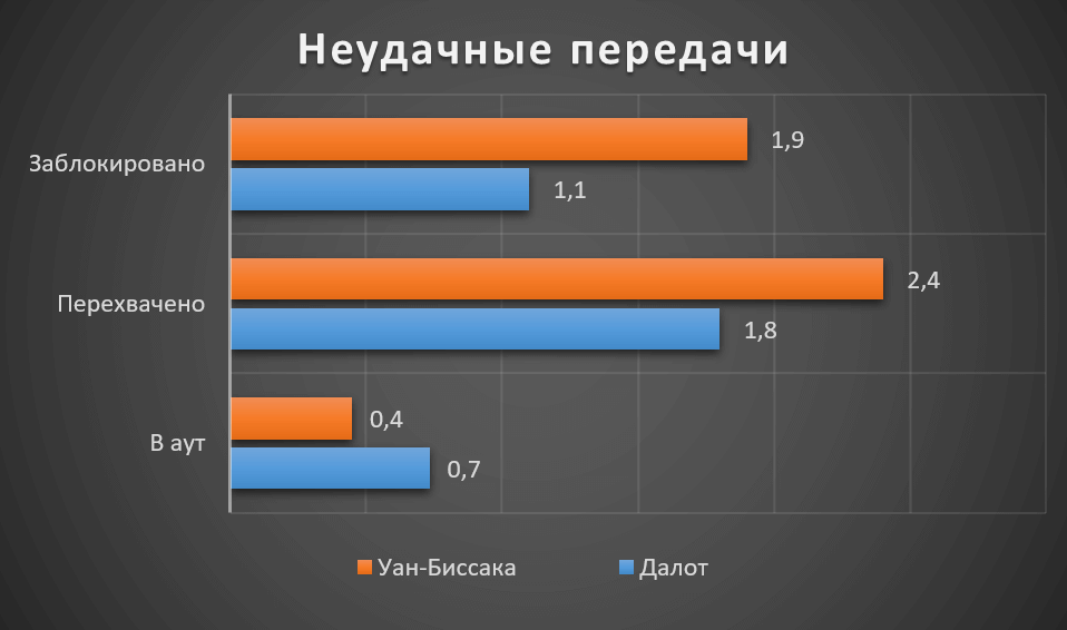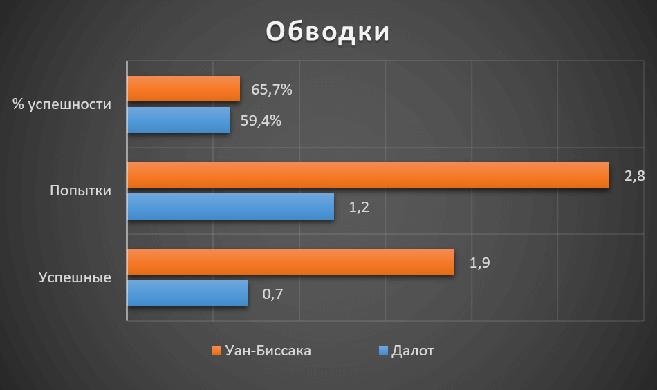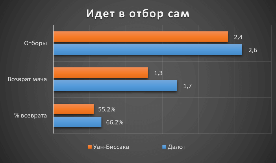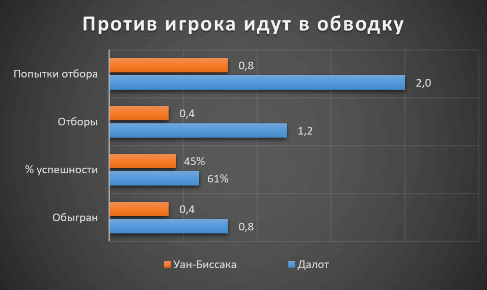 Португальца действительно обыгрывают немного чаще, но нам больше интересна третья шкала – процент успешных отборов, когда тебя пытаются обвести. И тут мы видим очень любопытные цифры – 61% у Далота и 45% у Уан-Биссаки. То есть португалец не только совершает больше отборов, но его еще и сложнее обыграть!