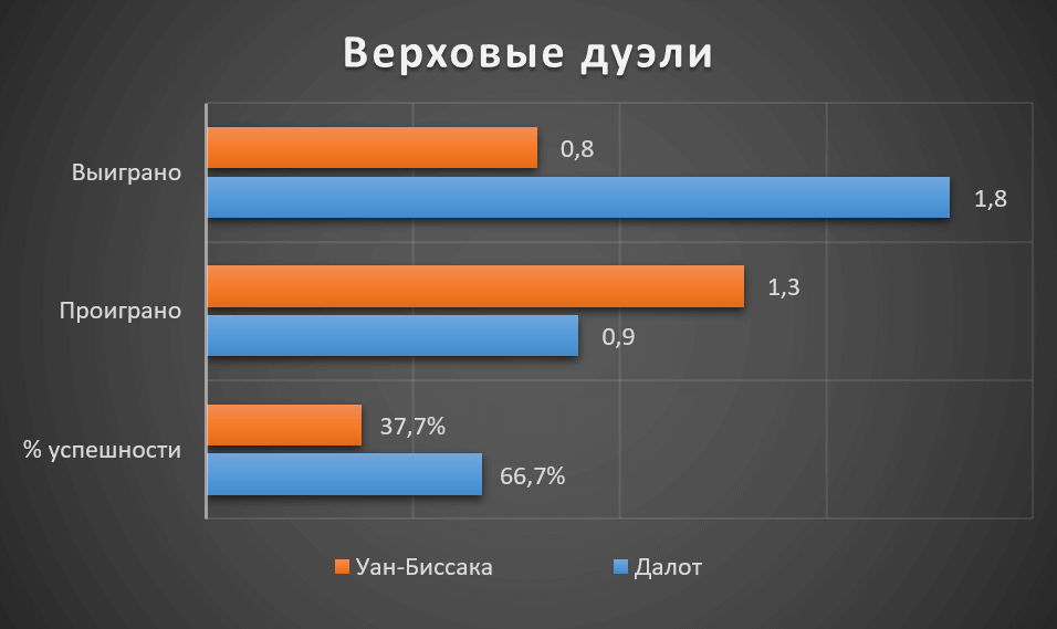 При одинаковом росте Далот сильно превосходит Уан-Биссаку и в игре головой. Португалец в среднем выигрывает 1,8 верховых дуэлей в за матч, в то время как англичанин всего 0,8. Процент выигранного воздуха у Далота выше в два раза. То есть он не только лучше играет на втором этаже, но еще и чаще это делает.