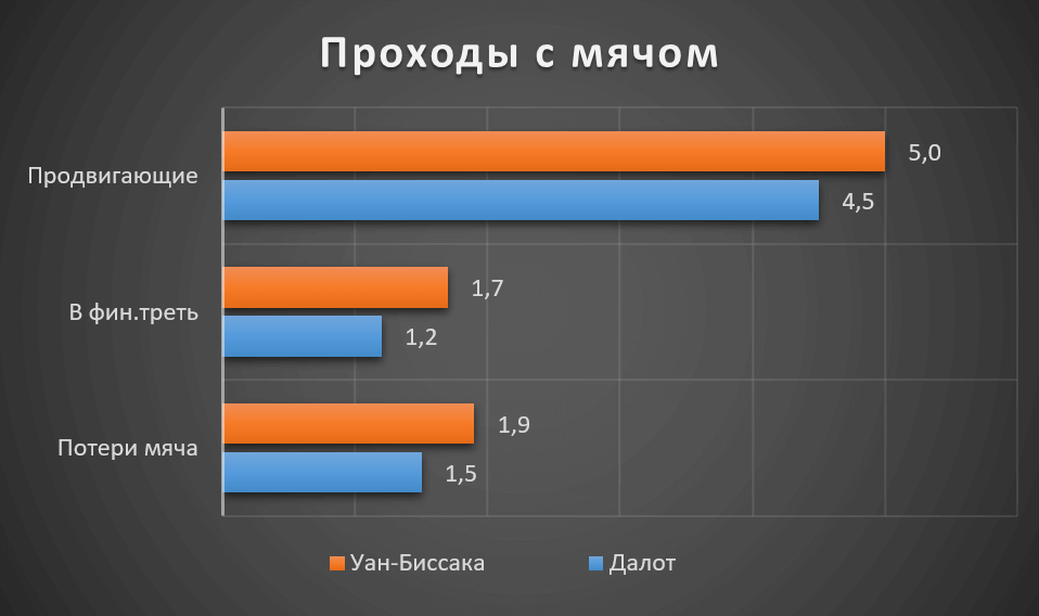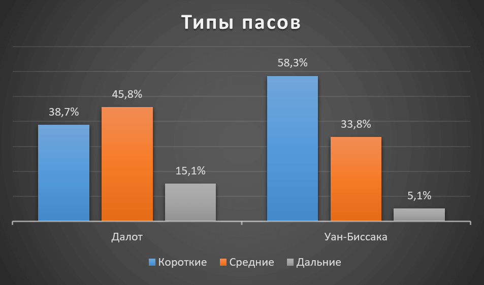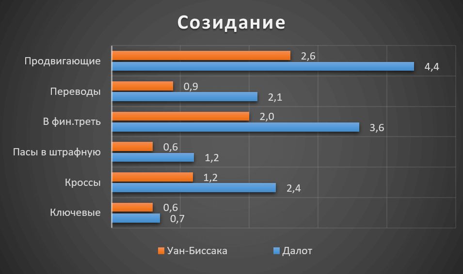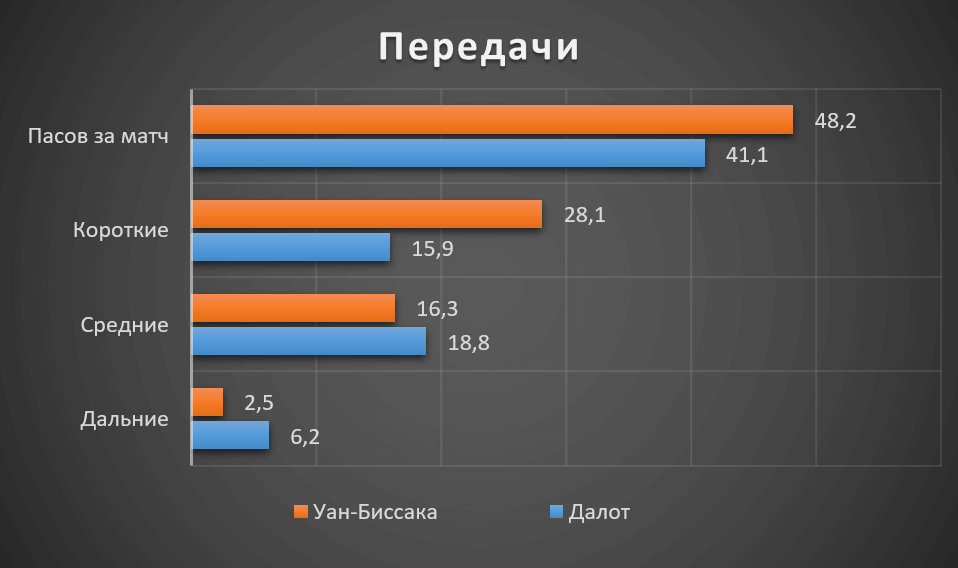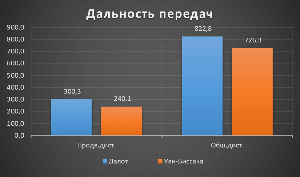 Далот на голову сильнее Уан-Биссаки по части построения атак через пас. Португалец почти в два раза чаще двигает мяч вперед, почти в два раза чаще пасует в финальную треть, в два раза чаще доставляет мяч в штрафную как за счет паса, так и за счет навесов. По переводам – изменениям направления атаки доставкой мяча на другой фланг – более, чем двукратное преимущество португальца. Уан-Биссака рядом только по ключевым передачам. Но про вклад в атаке мы поговорим дальше. А пока это еще один полнейший разгром. Прямо как в блоке про оборону.
