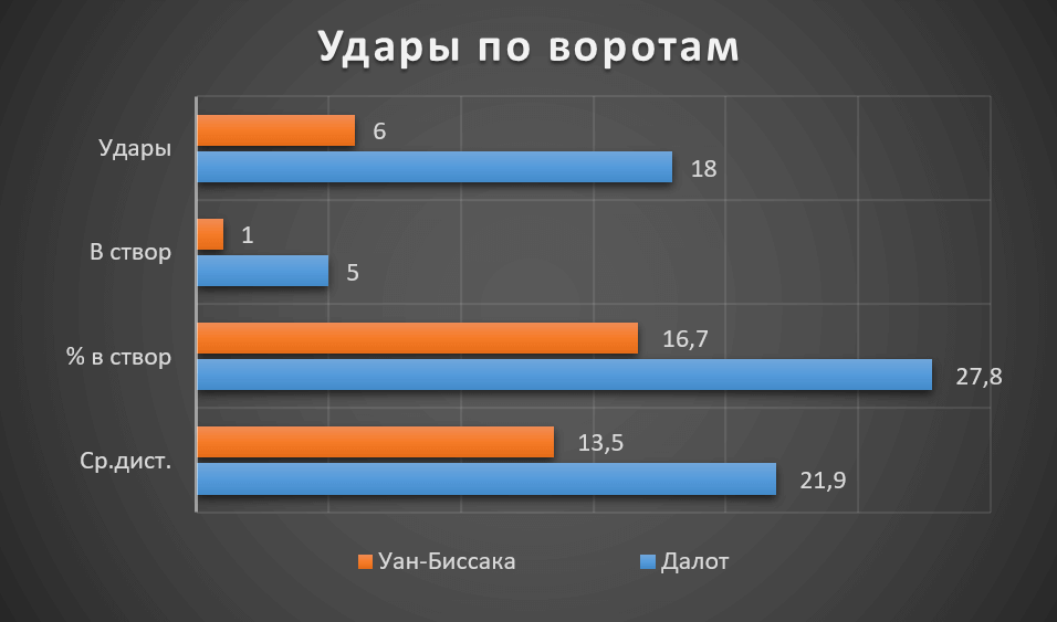 Далот бьет по воротам в три раза чаще и при этом обладает точностью в 27,8% против 16,7% у Уан-Биссаки. Чтобы вам стало совсем смешно, посмотрите на последнюю шкалу со средней дистанцией, с которой игроками наносится удар. Уан-Биссака бьет только из штрафной, но в створ попадает в пять(!) раз реже, чем Далот, который пуляет в основном из-за пределов вратарской коробки. Идем дальше.