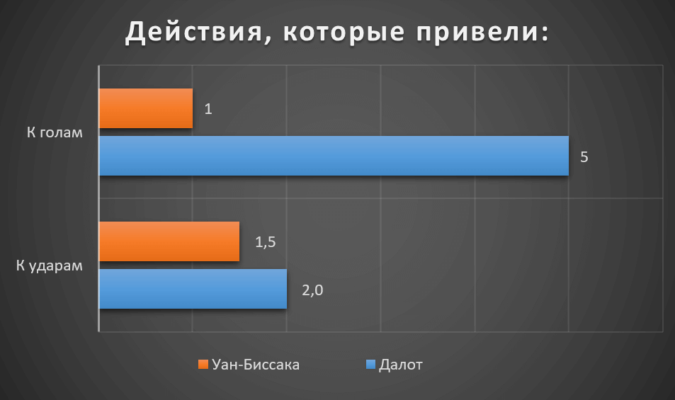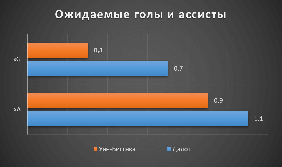 Что это значит: подсчитываются пасы, обводки, удары, заработанные фолы или даже отборы, в результате которых команда игрока нанесла удар или же забила гол. И в данном аспекте у Далота опять большое преимущество. Если моменты для ударов португалец создает не сильно чаще англичанина (но все еще чаще), то вот вклад в количество забитых голов у него явно повесомее. Действия Диогу у чужих ворот принесли «Юнайтед» пять голов, в то время как потуги Аарона всего один.