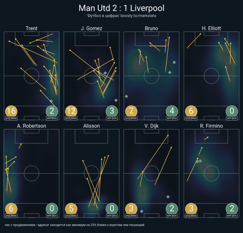 Но главным руководителем команды был, конечно, Бруну. Многие писали, что он был незаметным и самым худшим игроком на поле. Это вызывает лишь усмешку. Во-первых, португалец чаще всех в нашей команде касался мяча – в полтора раза больше ближайшего преследователя в лице Маласии (66 касаний у Бруну против 43 у Тайрелла) Во-вторых, Фернандеш за матч сыграл сразу на трех позициях. В начале игры он был под нападающими и накрывал защитников «Ливерпуля» едва ли не чаще всех в атакующей четверке. Затем он спустился чуть ниже, сконцентрировавшись на игре в районе центрального круга: дальние передачи, пасы вразрез, где-то придержать мяч, если это было необходимо. В конце матча он и вовсе стал третьим опорником, помогая сдерживать навал гостей. Все это очевидно было указанием Эрика, так как и сама команда опускалась ниже. Но именно положение Бруну было центральным во всех построениях. В-третьих, он отрабатывал по максимуму. Сделать резкий прострельный мяч на дальнюю Эриксену? Легко! Пойти в подкат после кривой передачи Скотта, чтобы вывести Элангу на пустые ворота? Пожалуйста! Руками показать Санчо, что Алиссон улетел на его замахе также, как и Милнер? Обязательно! Заменить МакТоминея/Фреда/Эриксена, задержавшихся в атаке, вырвав мяч с ногами? Без проблем! В итоге у него 4 возврата мяча, 3 отбора за 5 попыток, 3 перехвата, 5 выносов, 2 блока, 2 ключевые передачи. Да, Бруну заигрывался, потеряв мяч 5 раз. И игра в его исполнении была далеко не идеальная. Но говорить, что он был незаметен – бред.