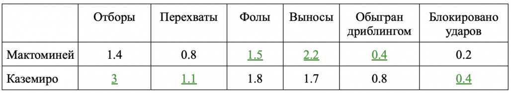 Это оборонительная статистика. Здесь мы видим, что эффективность Каза в обороне также превалирует над показателями Мактоминея. Шотландец превосходит бразильца в выносах, его меньше обыгрывают на дриблинге, а большее количество фолов у бразильца в среднем за игру объясняется тем, что Скотти вытеснен Карлосом из стартового состава и банально меньше времени проводит на поле.