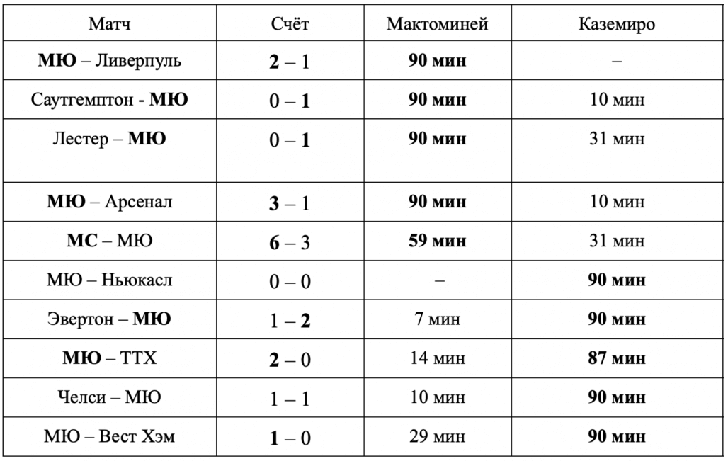 Будущее для Мактоминея также туманно. Он видится только как игрок-функция, пригодный лишь для того, чтобы сломать игру противника и разбить матч на эпизоды для удержания счета. Возвращаясь к разделению МакФреда: если Фред делит позицию с Эриксеном и превосходит датчанина по прессинг действиям почти в три раза ( к тому же у них хорошее взаимодействие с Каземиро ещё со сборной Бразилии), то Скотт, в свою очередь, тотально уступает Каземиро. Это и на глаз видно, но лучше подкрепить статистикой.