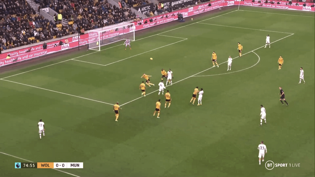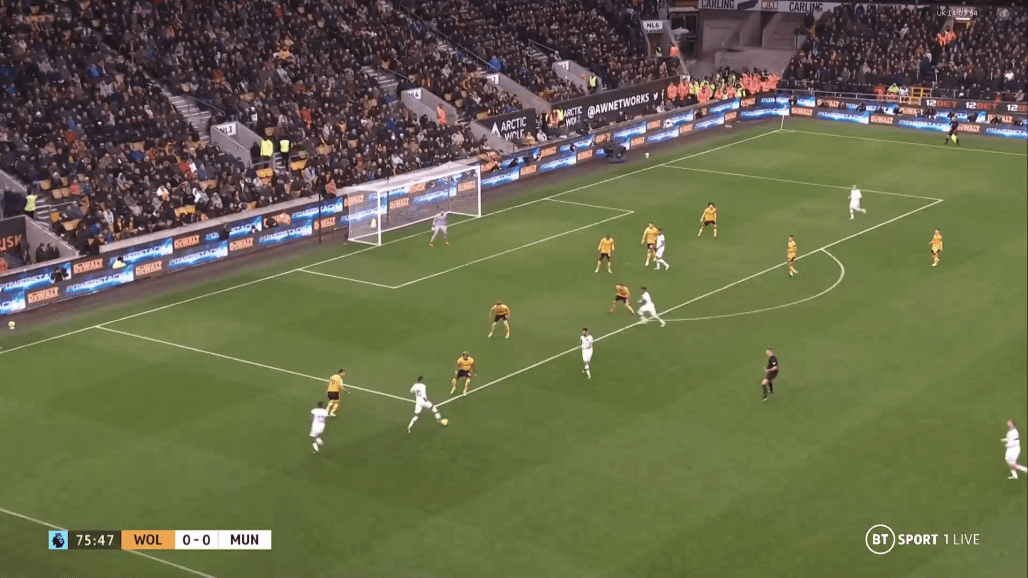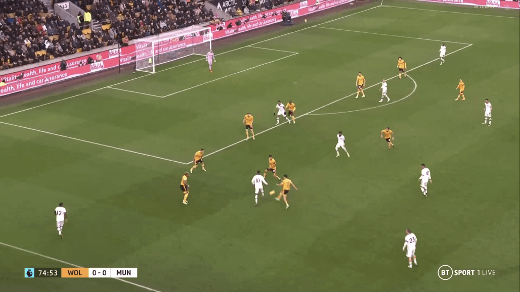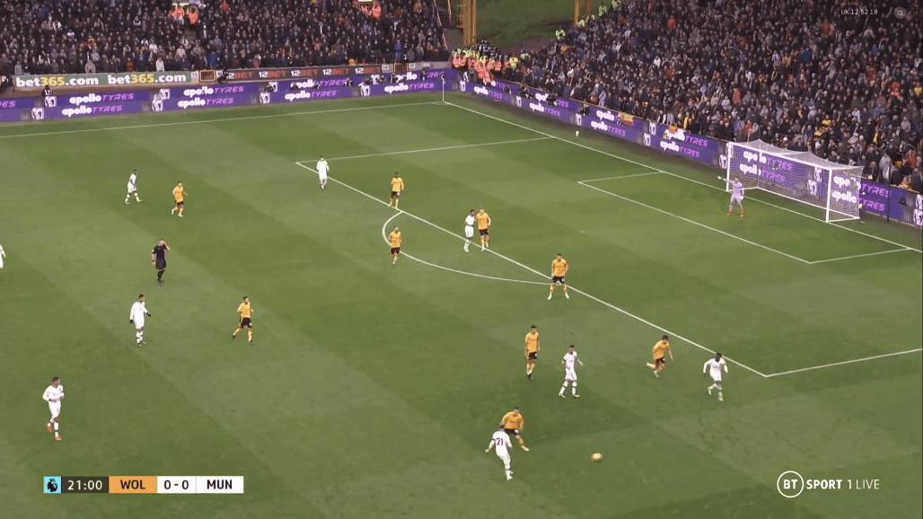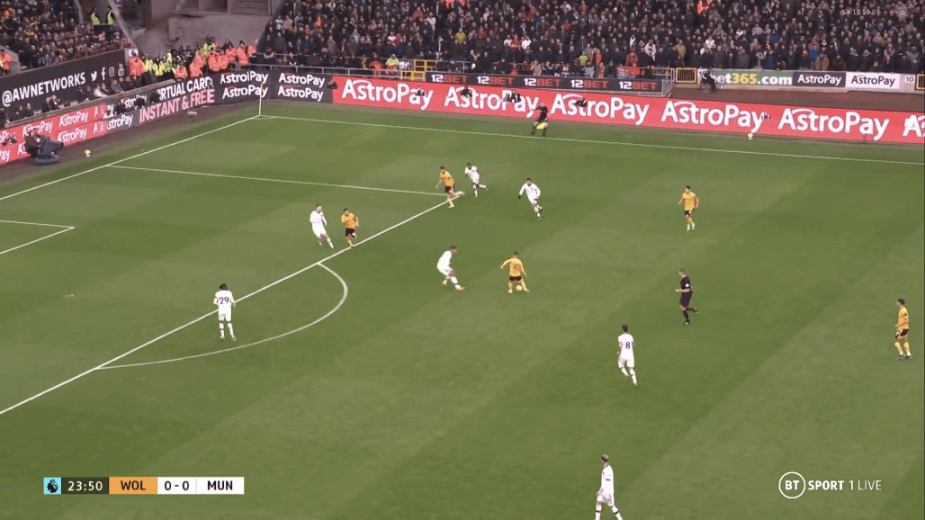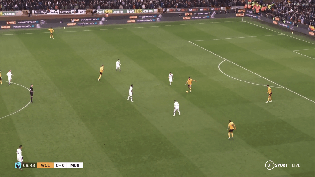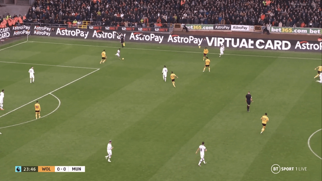 «Вулвз» начали матч, активно задействовав фланги с Семеду и Буэно, используя Рубена Невеша и Жоао Моутинью в качестве игроков, дающих направление атак. Но заданная тренером «волков» тактика не давала результата вследствие отлично организованной оборонительной игры на флангах и при прессинге центральных полузащитников нападающими «Юнайтед». С таким игроком как Каземиро, атакующая четверка дьяволов могла позволить себе активно выдвигаться выше к оборонительным редутам хозяев, отрезая четверку защитников и Нунеша от остальной команды.