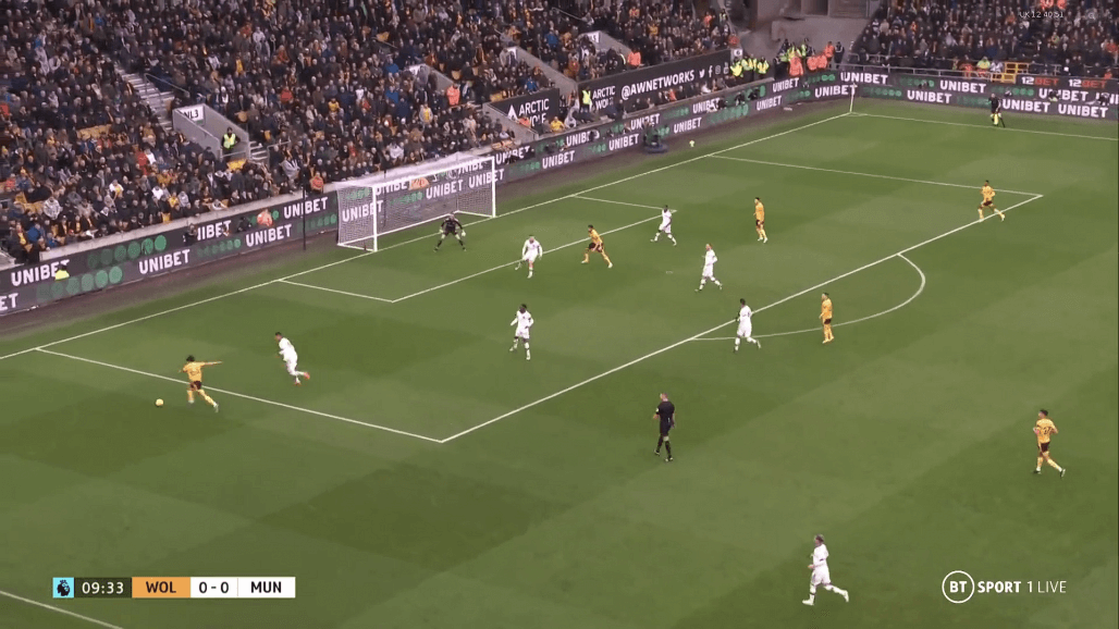 Огромную роль сыграло слабое индивидуальное выступление футболистов «Вулверхэмптона». Ниже мы видим как Буэно отдает передачу с фланга в зону Диего Косты вместо того, чтобы отправить мяч к краю штрафной, где Маласия оставался один против двух игроков соперника. К счастью, Рафаэль Варан заблокировал передачу португальца.