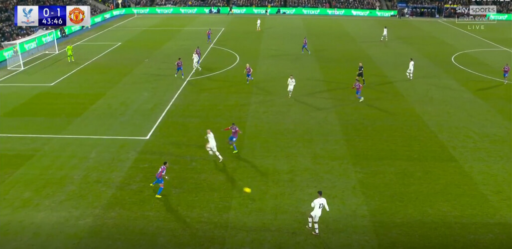 Датчанин сначала сделал простую передачу Рэшфорду, который вернул мяч Кристиану, внезапно вбежавшему в зону между защитниками «Пэлас». Эффект неожиданности сыграл не только от забегания Эриксена, но и от вовремя выполненной передачи англичанина, который обычно начинает возиться с мячом или ждать подключения по центру. Но, вместо ожидаемой передачи на Бруну, Рэши принял действительно важное, и, что немаловажно, своевременное решение. Кристиану оставалось лишь выкатить мяч под удар Фернандешу, которого оставили все игроки обороняющейся стороны, увлеченно убежавшие за Вегорстом.