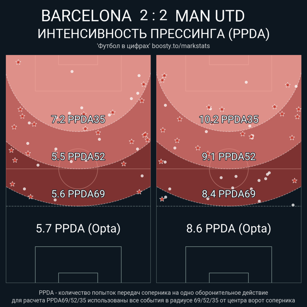 Обе команды показали интенсивный футбол, попеременно овладевая инициативой. При этом не было замечено, чтобы какая-либо из команд полностью выключалась из прессинга, хотя, конечно, подопечные Хави прессинговали интенсивнее и выше. Это подтверждается показателем PPDA (количество передач соперника на одно оборонительное действие), который составляет 5,7 для «Барселоны» и 8,6 для «Юнайтед». Если не брать в расчет показатель PPDA в радиусе 35 метров, то прессинг соперника был эффективнее, чем у подопечных тен Хага.