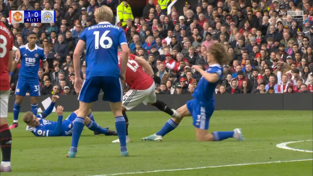 В первом случае все началось с ошибки Фреда, который пытался подсунуть мяч Линделефу. В итоге, Барнс отыгрывается с Ихеаначо. На нигерийца зачем-то выдвигается Лича, хотя Шоу был совсем близко. Келечи реагирует на это и отдает мяч Харви. И ведь нападающий «Лестера» поймал самый идеальный момент для удара, когда испанец начал сближение. Но Давид успел сложиться и нейтрализовать угрозу.