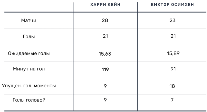 На международную паузу Харри и Виктор ушли, имея на своём счету равное количество голов в чемпионате. По затраченным минутам на один гол нигериец превосходит английского страйкера, но меньшее количество матчей говорит о травматичности главного нападающего «Наполи»: Виктор пропустил 6 игр из-за повреждения бедра. Харри же отбегал практически все 28 матчей в чемпионате от свистка до свистка.