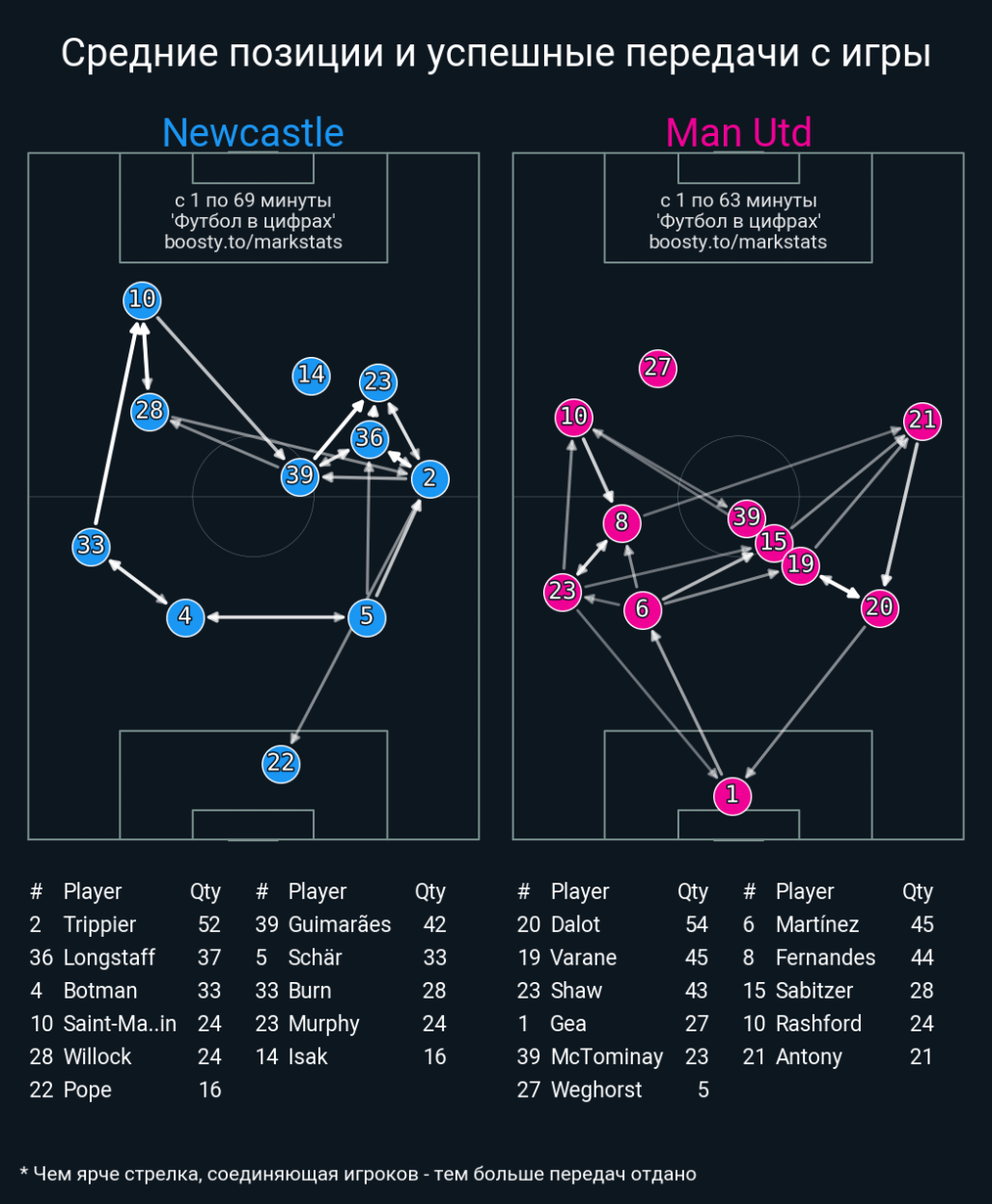 Не так часто у Фернандеша касаний на своей половине поля больше, чем на чужой. При этом, опять идет перекос в сторону левого фланга, где Рэшфорд болт клал на помощь Шоу. Бруно обязан играть у штрафной и творить там, а не думать, как бы получить мяч под прессингом на своей половине поля, каким-то чудом протащить его на 30 метров, а затем вырезать передачу на партнера.
