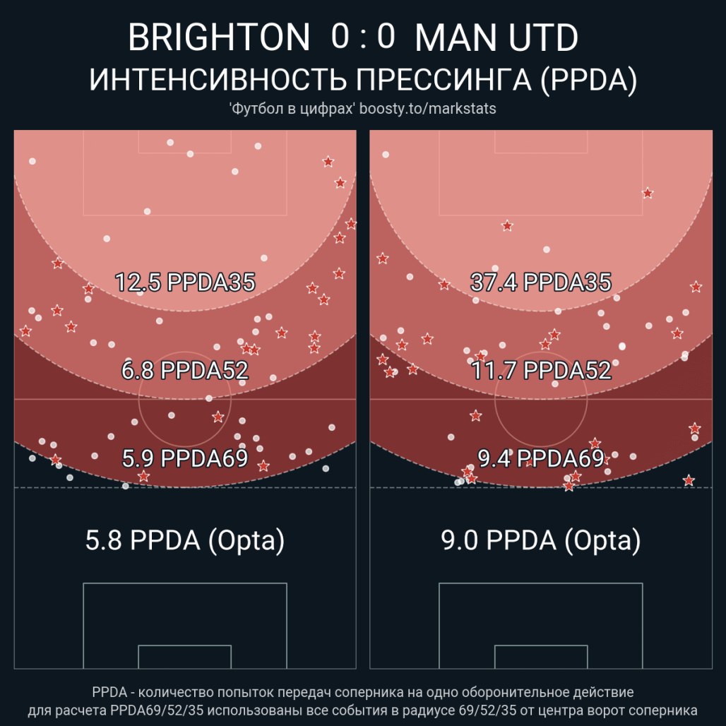 Эрик знал, что команда де Дзерби отлично подготовлена тактически, поэтому выбрал максимально пассивный старт. «Манчестер Юнайтед» позволял очень много двум центральным защитникам «Брайтона». У Уэбстера и Данка на двоих 235 передач. Для понимания, у всех наших игроков 412.