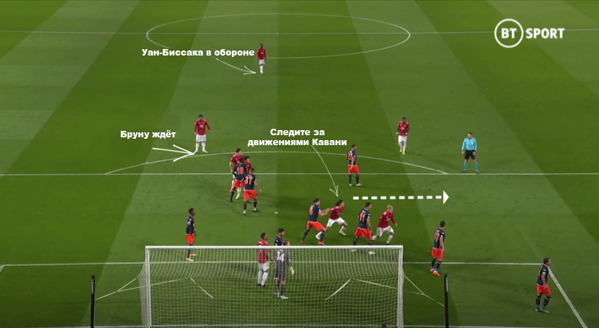 Уан-Бисака получает мяч от Фреда на правом фланге. Ван Де Бек предлагает Аарону продолжить атаку передачей на Кавани, который открывается чуть выше всё на том же правом фланге.