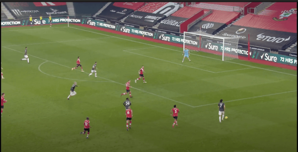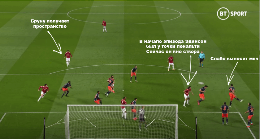 Бруну подбирает мяч в полном одиночестве, потому что тех, кого не увёл Кавани, увели Магуайр и Линделёф.