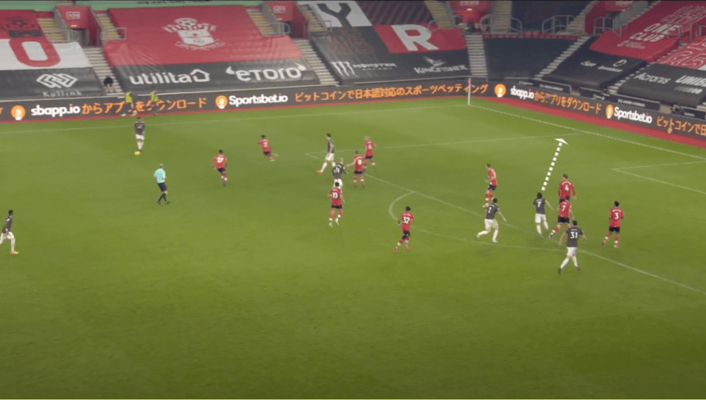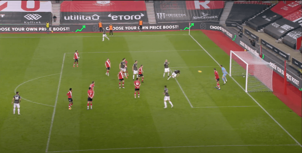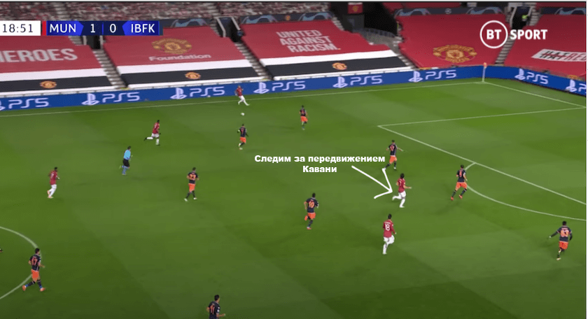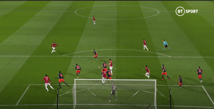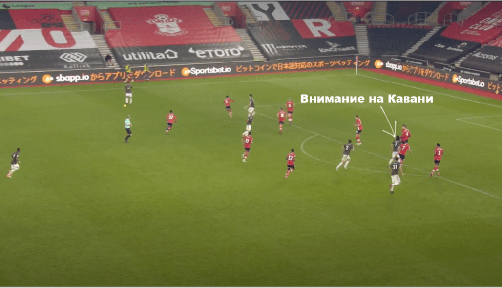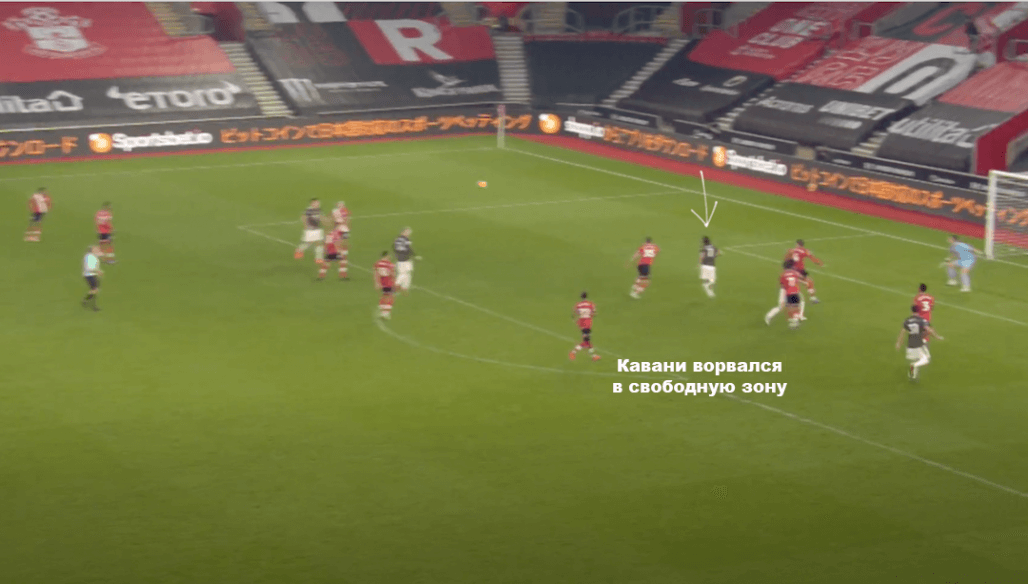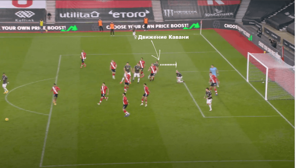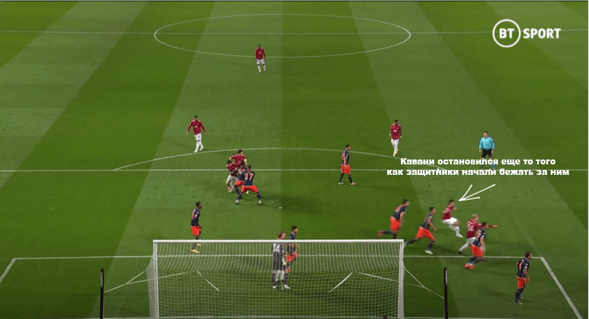Дальше всё просто. Кавани может делать запрос на ближнюю штангу, куда несётся Ван Де Бек, а может на дальнюю, куда спешит одинокий Рэшфорд. Также в центр штрафной бежит Бруну. Уругвайцу остаётся лишь выбрать оптимальный вариант.
