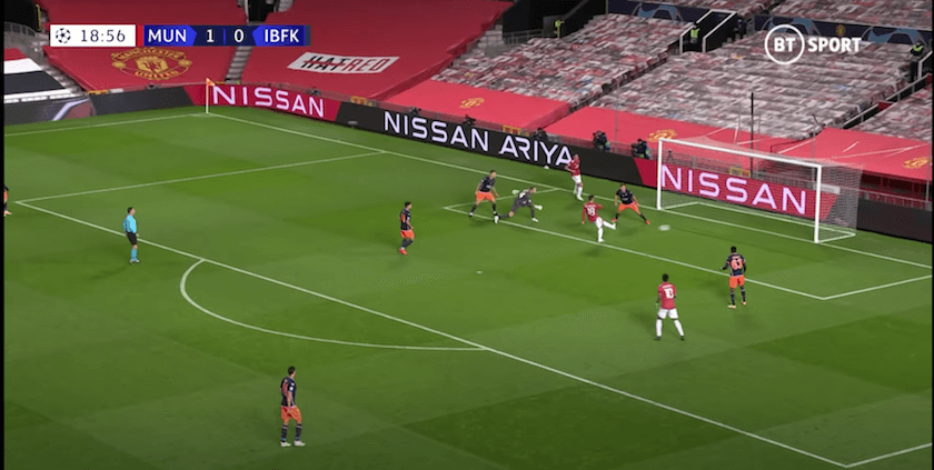Де Хеа вводит мяч в игру пасом на Матича, серб отдаёт на Кавани. Эдинсон выбегает навстречу этой передаче, уводя за собой обоих защитников «Истамбула», и в одно касание скидывает Ван Де Беку. Голландец же посылает мяч на ход свежему Гринвуду, у которого гектар свободного пространства справа.