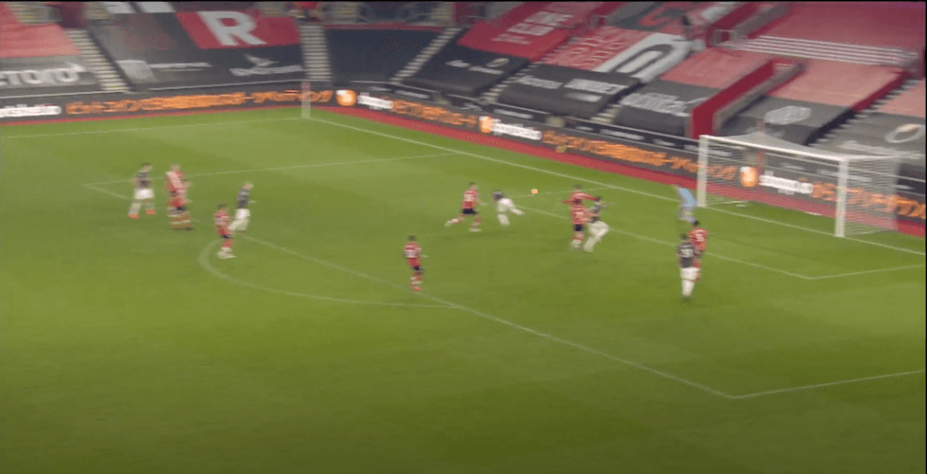 Кавани делает кросс именно в район одиннадцатиметровой отметки, прямо в ногу Фернандешу. Беднарек (номер 35) был готов играть на втором этаже, но уругваец пустил мяч низом, да ещё и за спиной у защитника. Бруну не пришлось даже бить в одно касание. Идеальное исполнение.