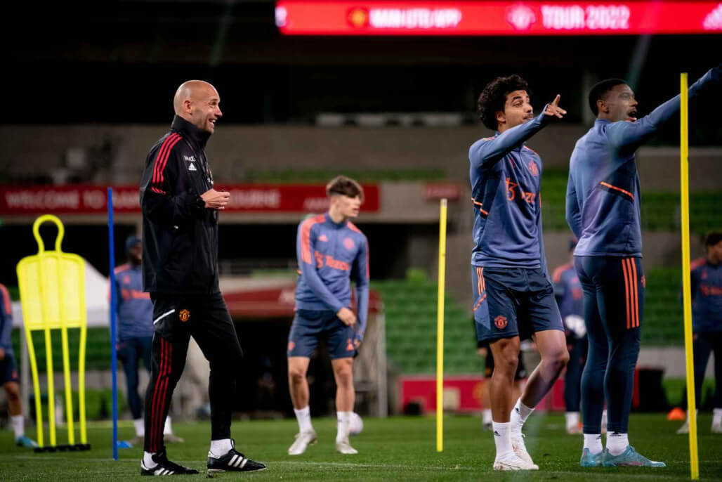 Каждый раз, когда мяч выходил за пределы поля, тут же вводился другой – не было никакого промедления, и было очевидно, что реакция и резкость игроков, не говоря уже о скорости и точности их паса, требуют работы. Тен Хаг и его помощник Митчелл ван дер Гаг постоянно говорили игрокам прессинговать и действовать быстрее, а тренер Моусон кричал им подходить к мячу и закрывать пространство в моменты, когда они выключались из игры.