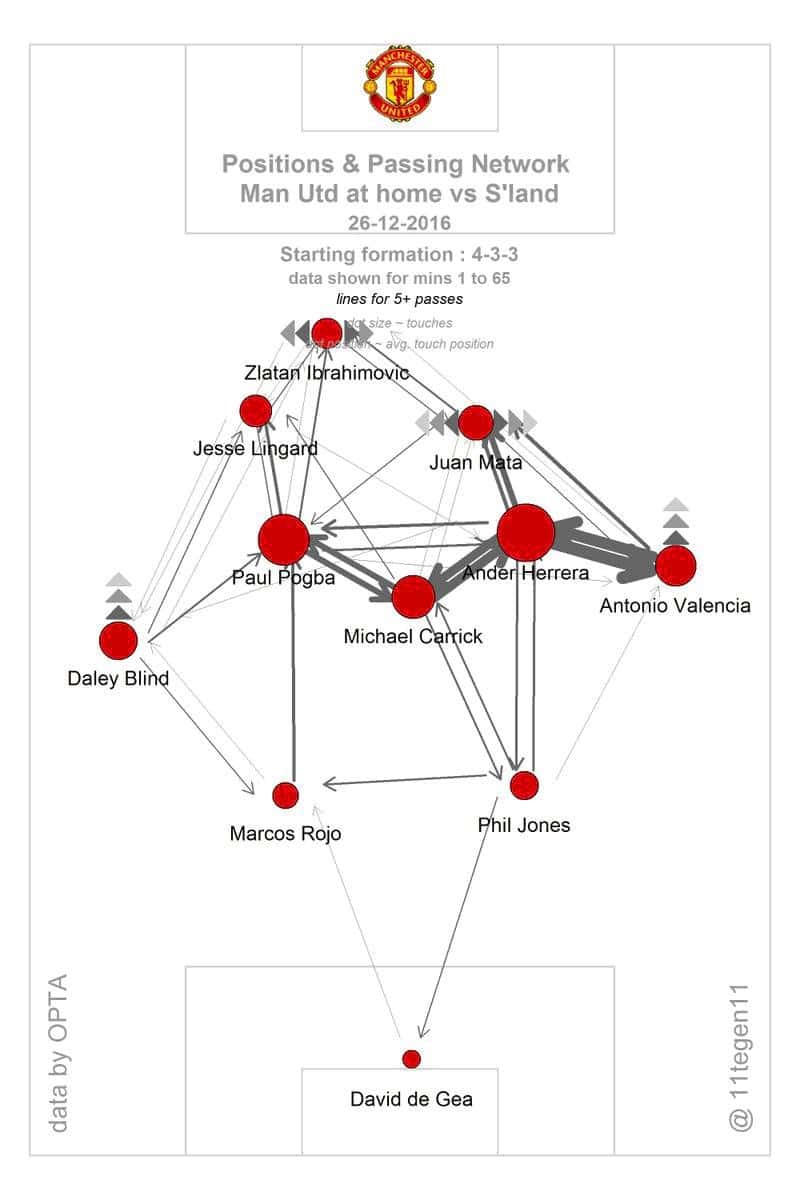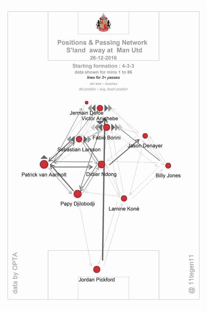 «Сандерленд» доставил определенные проблемы «Юнайтед» в первом тайме, что послужило причиной недовольства Моуринью. Преимущественно игра «котов» развивалась через дальние выносы голкипера на Виктора Аничебе, набравшего впечатляющую форму в последнее время. Это было самой популярной комбинацией пасов у «Сандерленда» в прошедшем матче – 12 точных пасов от вратаря до нигерийского нападающего. Другим вариантом был выход из обороны через одного из лучших левых защитников АПЛ 2016 года – Патрика ван Аанхольта, но они чаще всего пресекались. Его коллега с противоположного фланга справлялся значительно лучше – Билли Джонс стал лидером команды по ключевым пасам (2).