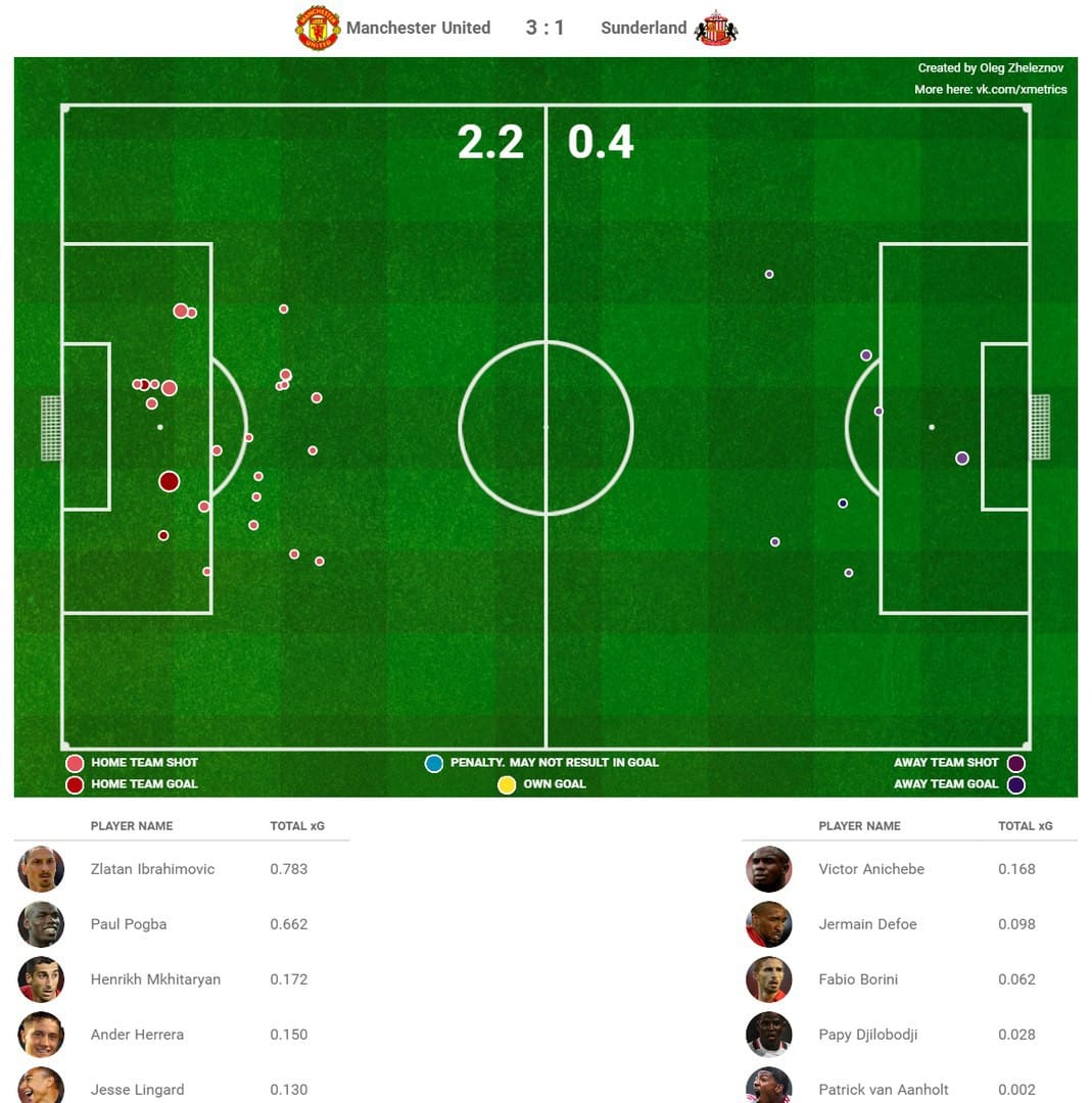 Показывающий чудеса результативности, швед вместе с Полем Погба в прошедшем матче и многих других представляли основную угрозу воротам соперников – против «Сандерленда» швед и француз создали 1,5 xG из общекомандных 2,2. В реальных цифрах это выразилось в 12 ударах на двоих. Златан не реализовал большинство своих моментов, но все равно забил гол и отдал два ассиста – превосходный результат. Примечательно, что последние 7 голов «Юнайтед» были забиты шведом или с его передачи. Вклад Ибрагимовича в атакующую активность команды (44% забитых голов) значительно превосходит прошлый сезон, в котором отличались преимущественно полузащитники.