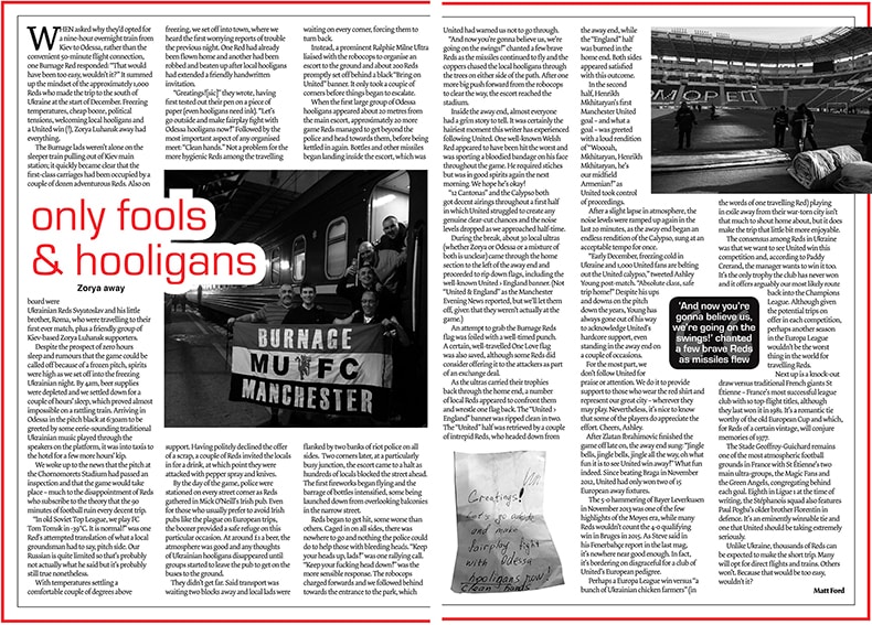 Когда мы спросили, почему фанаты предпочли добираться от Киева до Одессы девятичасовым рейсом на поезде, а не на самолёте, один из них сказал: «Это было бы слишком просто, нет?». Это отразило дух, по меньшей мере, тысячи фанатов «Юнайтед», добравшихся до Украины в начале декабря. Лютый холод, дешёвая выпивка, политическая нестабильность, местные ультрас и победа «Юнайтед», - в этом выезде было всё.