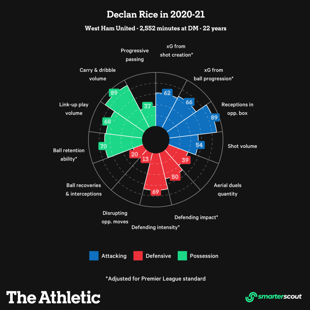 Деклан также сильно прибавил в таких компонентах, как прессинг и контрпрессинг соперника. Его интенсивность при обороне достигает вполне хорошего – 69 баллов – уровня, в то время как вклад в защитные действия оценивается всего в 50.
