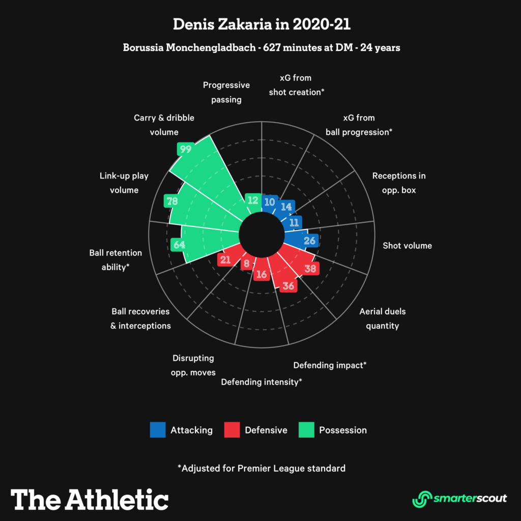 Полузащитник «Боруссии» из Мёнхенгладбаха привлек к себе внимание яркой игрой в Бундеслиге и Лиге чемпионов в текущем сезоне. Немецкая команда играет стандартной 4-2-3-1, а Закария располагается в центре поля одним из двух опорников. Он великолепно продвигает мяч (99 баллов из 99 по части ведения мяча и дриблинга) и более того, очень хорошо умеет его держать. Закария часто стягивает на себя игроков соперника, открывая зоны для партнеров.