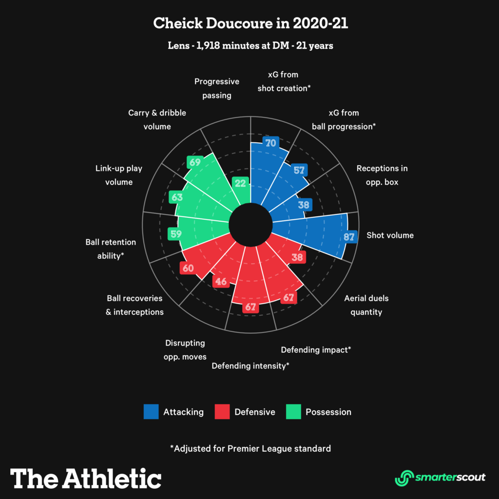 24-летний опорник, в первую очередь, занимается тем, что не дает играть противнику – у него невероятные показатели отборов (оценка в 99 баллов за сорванные атаки противника) и перехватов (навык возврата владения оценили в 73 балла). На графике свыше – красные зоны.