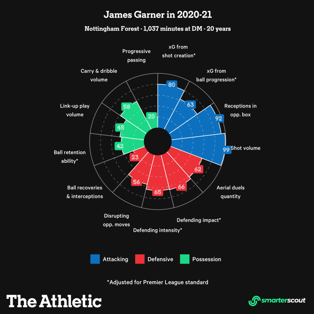 Гарнер здорово умеет руководить игрой из глубины, продвигая мяч вперед за счет солидных дальних передач. Да и вообще, с культурой паса у молодого англичанина все отлично. Также из плюсов Гарнера хочется отметить его навыки перехватов, большую вовлеченность в оборонительные действия команды (Джеймс часто возвращается в свою штрафную и выносит мяч) и на удивление крутое умение подключаться к атакам вторым темпом, врываясь в штрафную соперника.