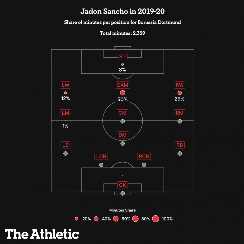 Однако статистика разрушает этот миф. В сезоне 2019/20, своем лучшем в «Боруссии» (20 голов и 20 ассистов во всех турнирах), Санчо провел всего 29% времени на правом фланге в связке с Хакими. В основном он играл в центре – 50% на позиции десятки и 8% как центрфорвард. Иногда он играл слева – 13% времени.