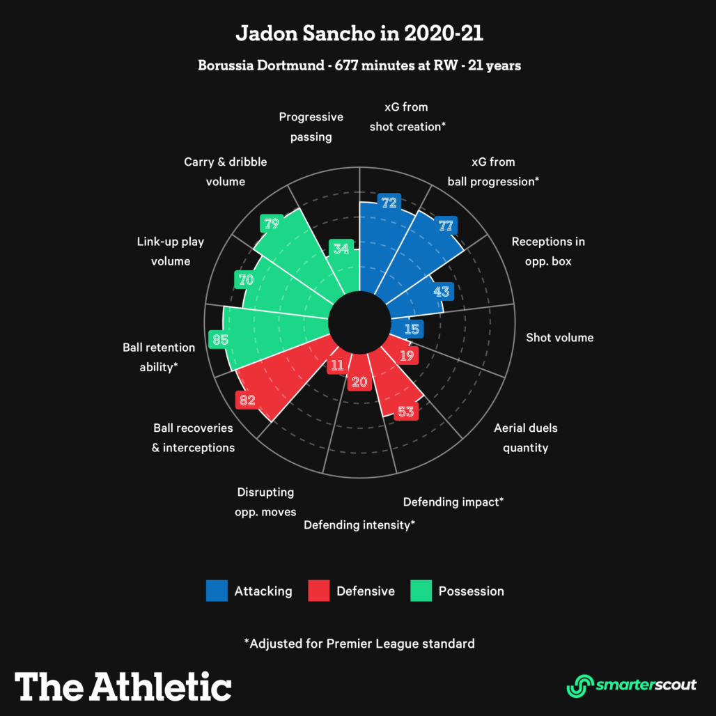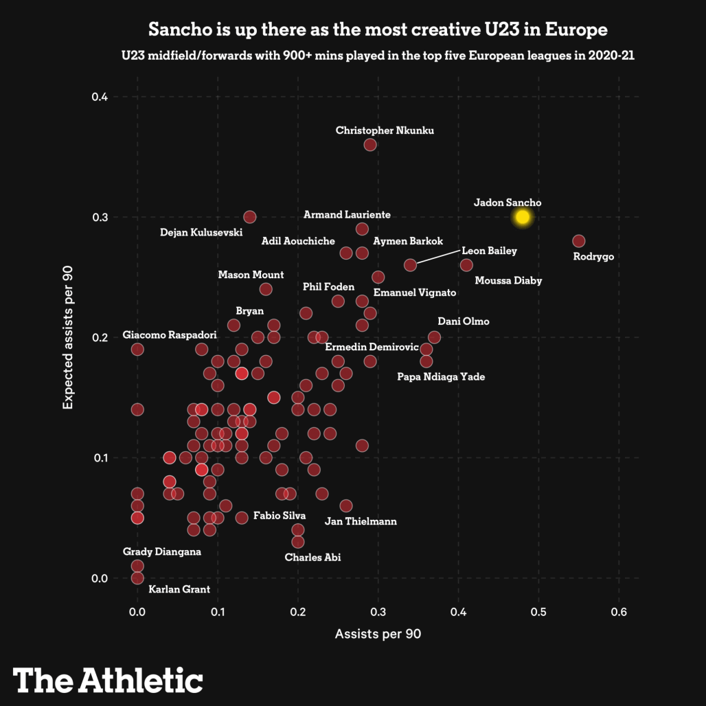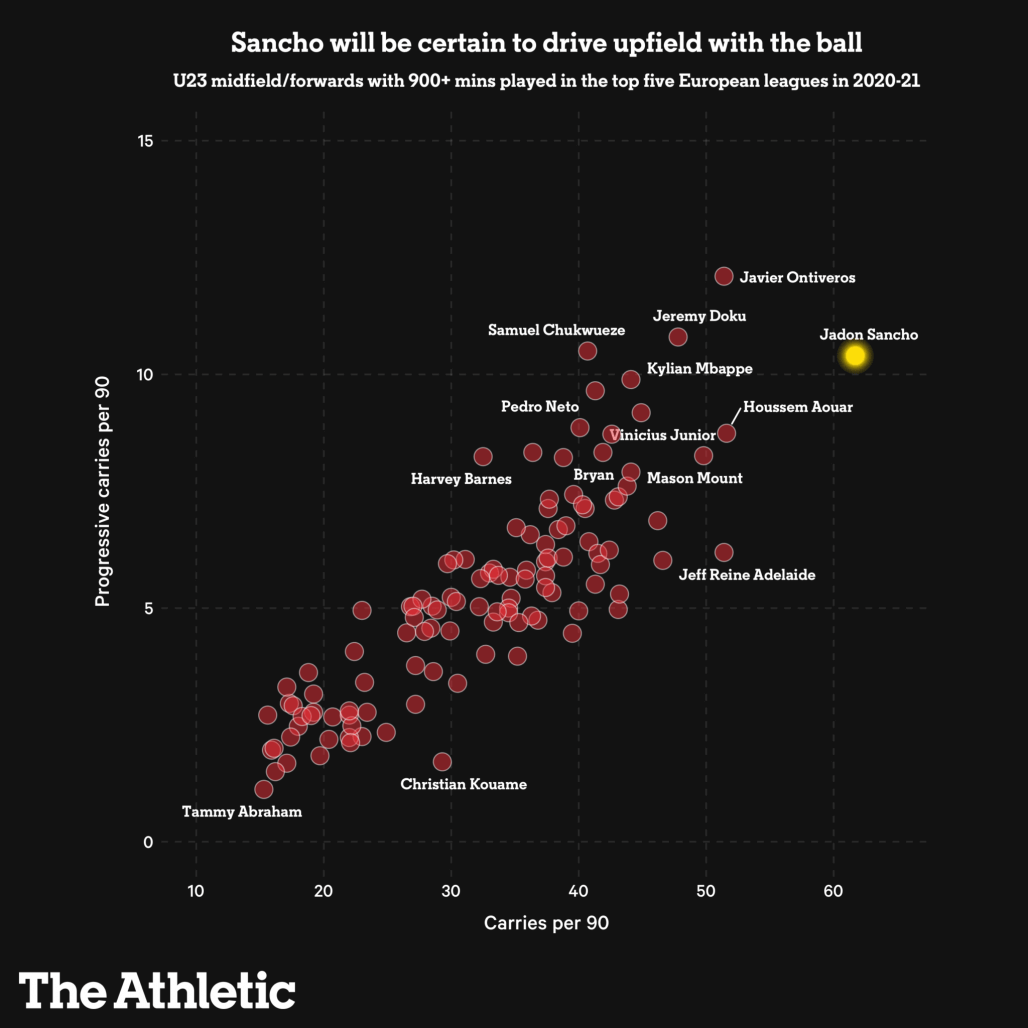 По данным Fbref, ни один другой полузащитник или нападающий до 23-х лет из пятерки лучших лиг Европы не протаскивал мяч чаще Джейдона – 60,7 за матч. Причем 10,4 протаскиваний доходят непосредственно до штрафной соперника.